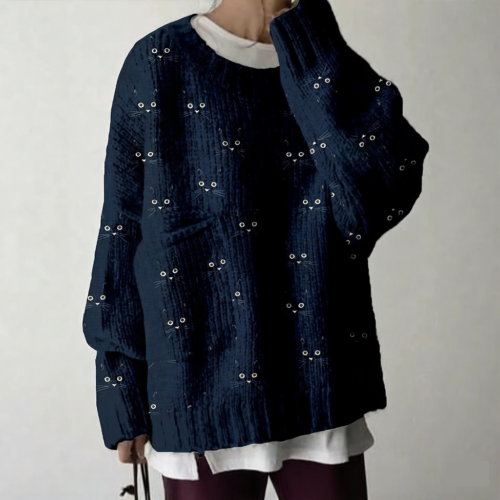 Cozy Sweater With A Cute Cat-face Pattern And Large Pockets